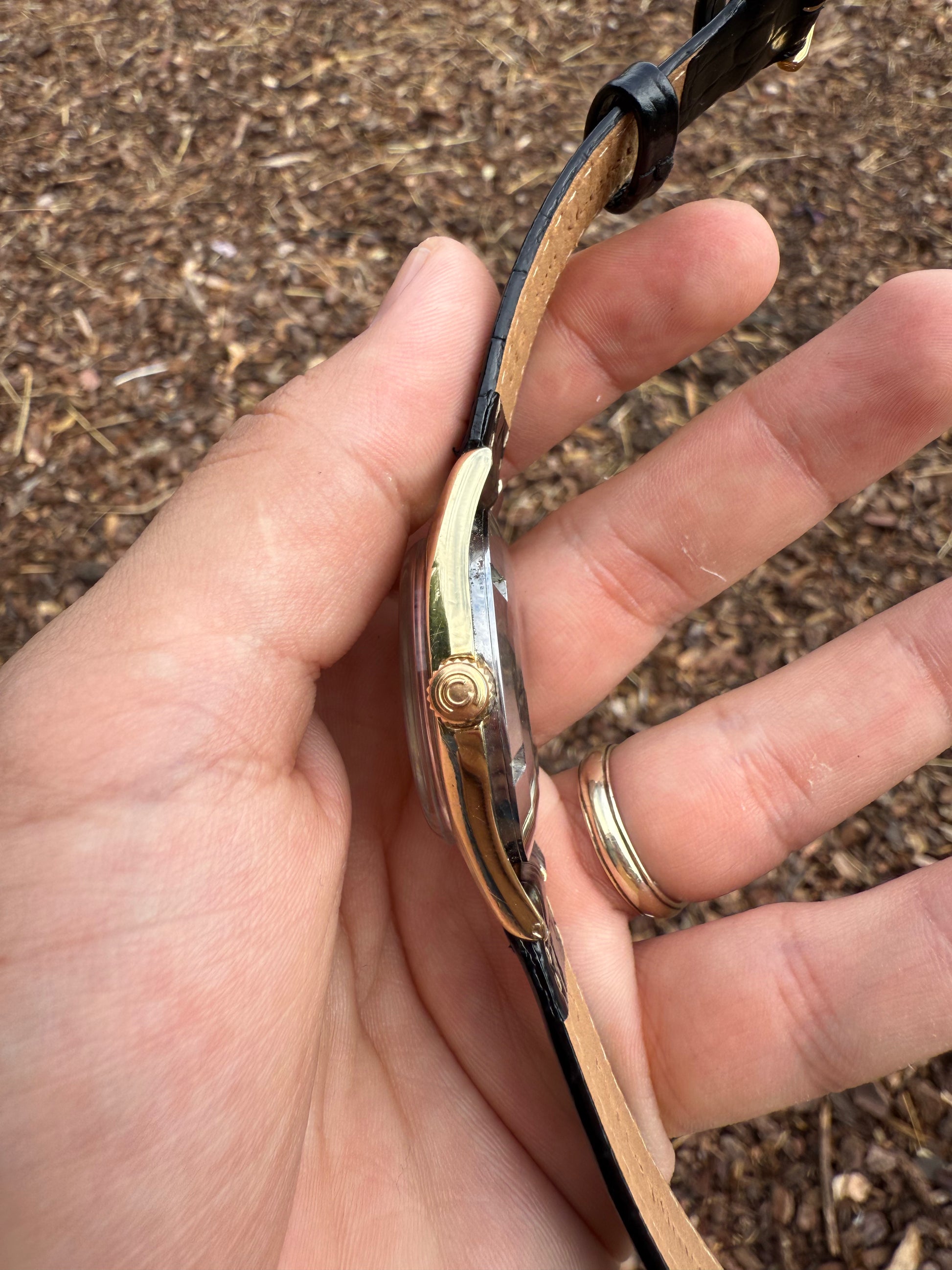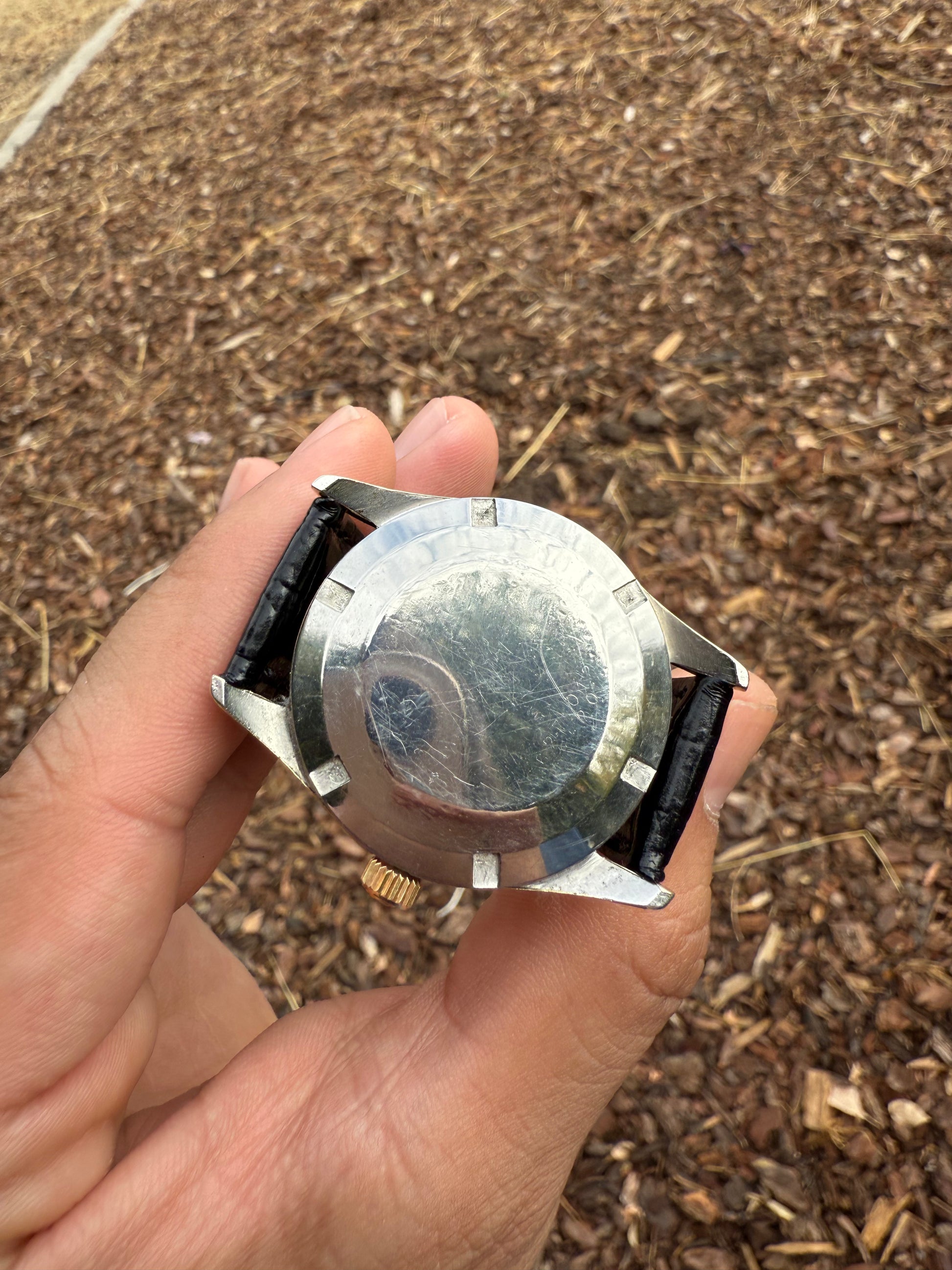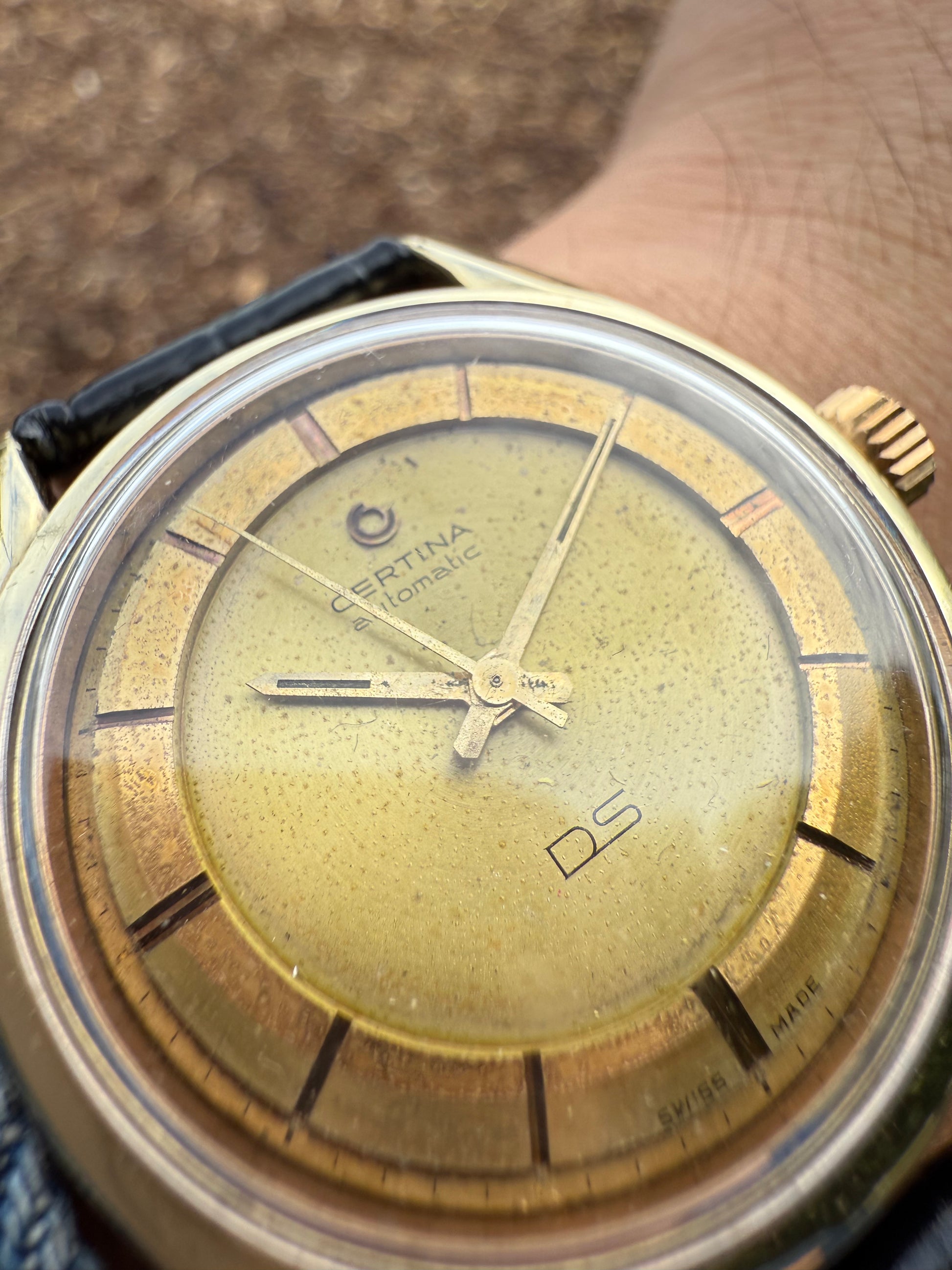 Este modelo es de los primero Ds del mercado cuando aun no portaban la mítica tortuga en la parte de atrás por eso llamado el Pre-tortuga y en la caja por dentro viene especificado Swiss patent pending que quiere decir que la patente Ds que traducido al español quiere decir DOBLE SEGURIDAD aun estaba pendiente de aprobación una verdadera joya de colección en buen estado. Este reloj incorpora una esfera especial de oro de 18k que es solo baño con textura similar al Universal Geneve Polerouter.