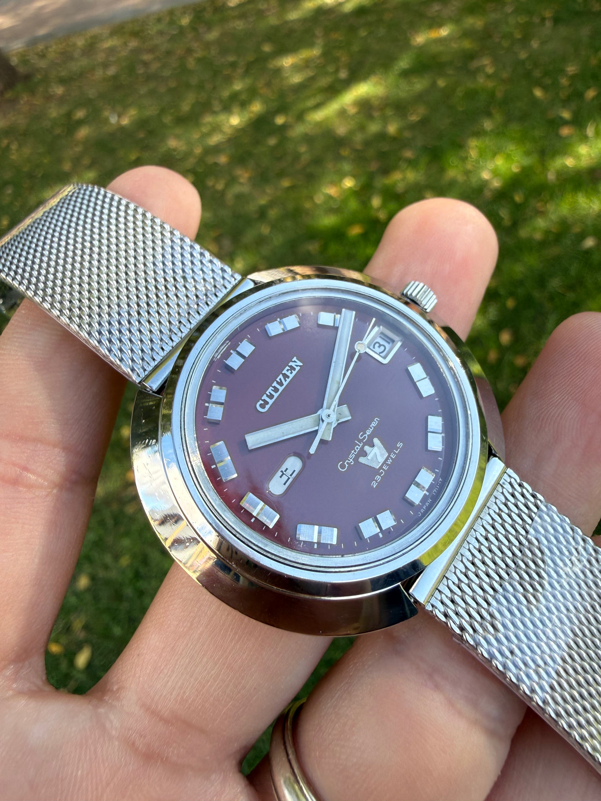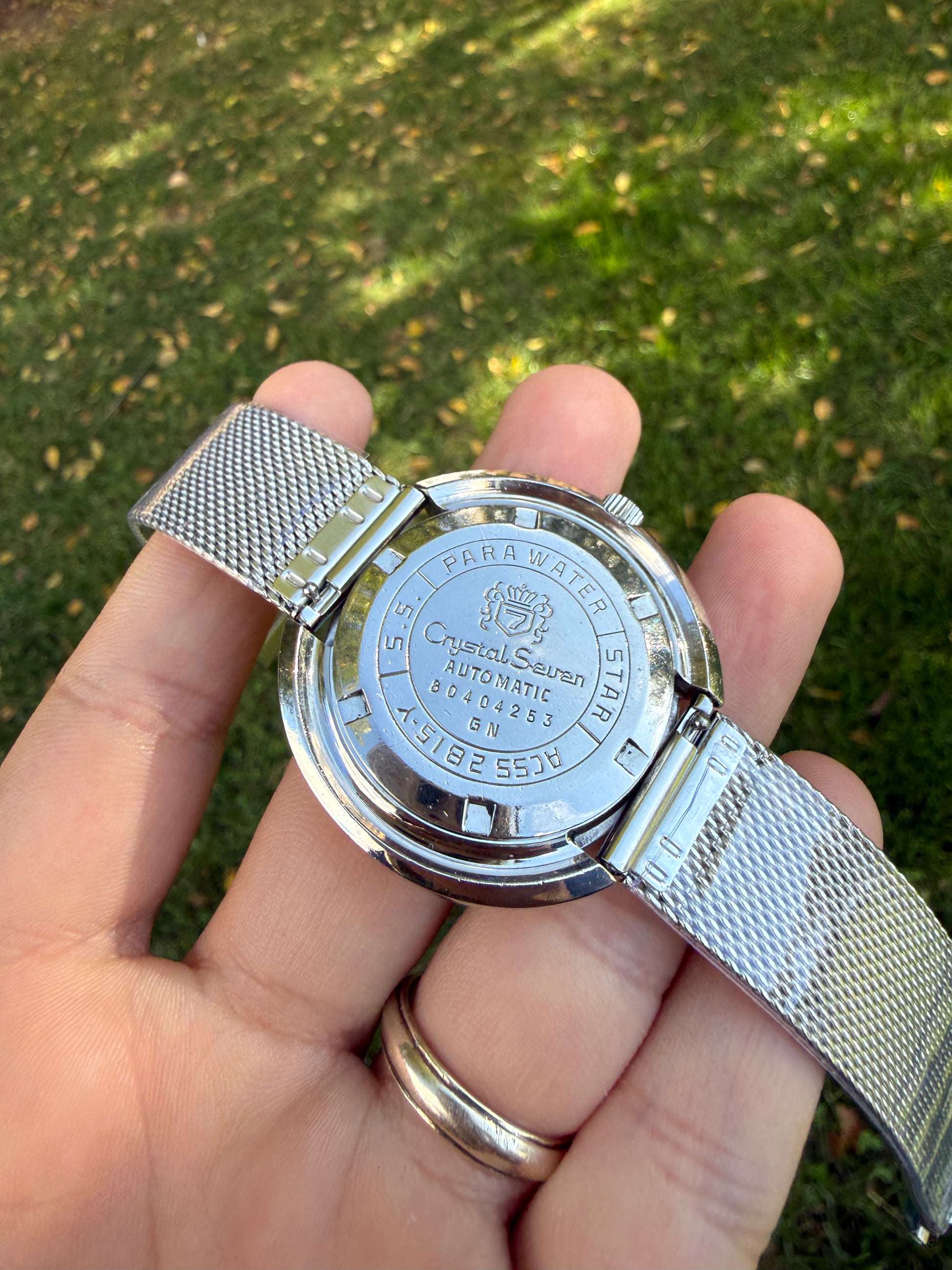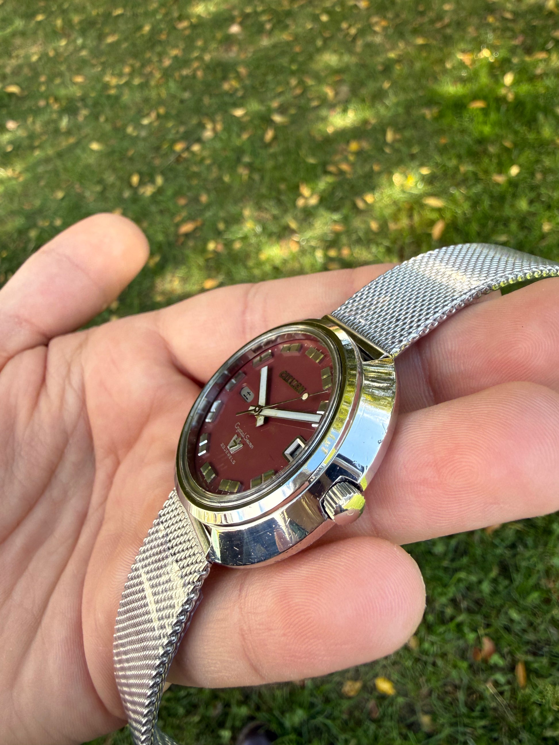 Reloj vintage UFO con una forma muy diferente y rara con calendario de japonés kanji y al lado derecho una ventanilla para poder ver el día del mes