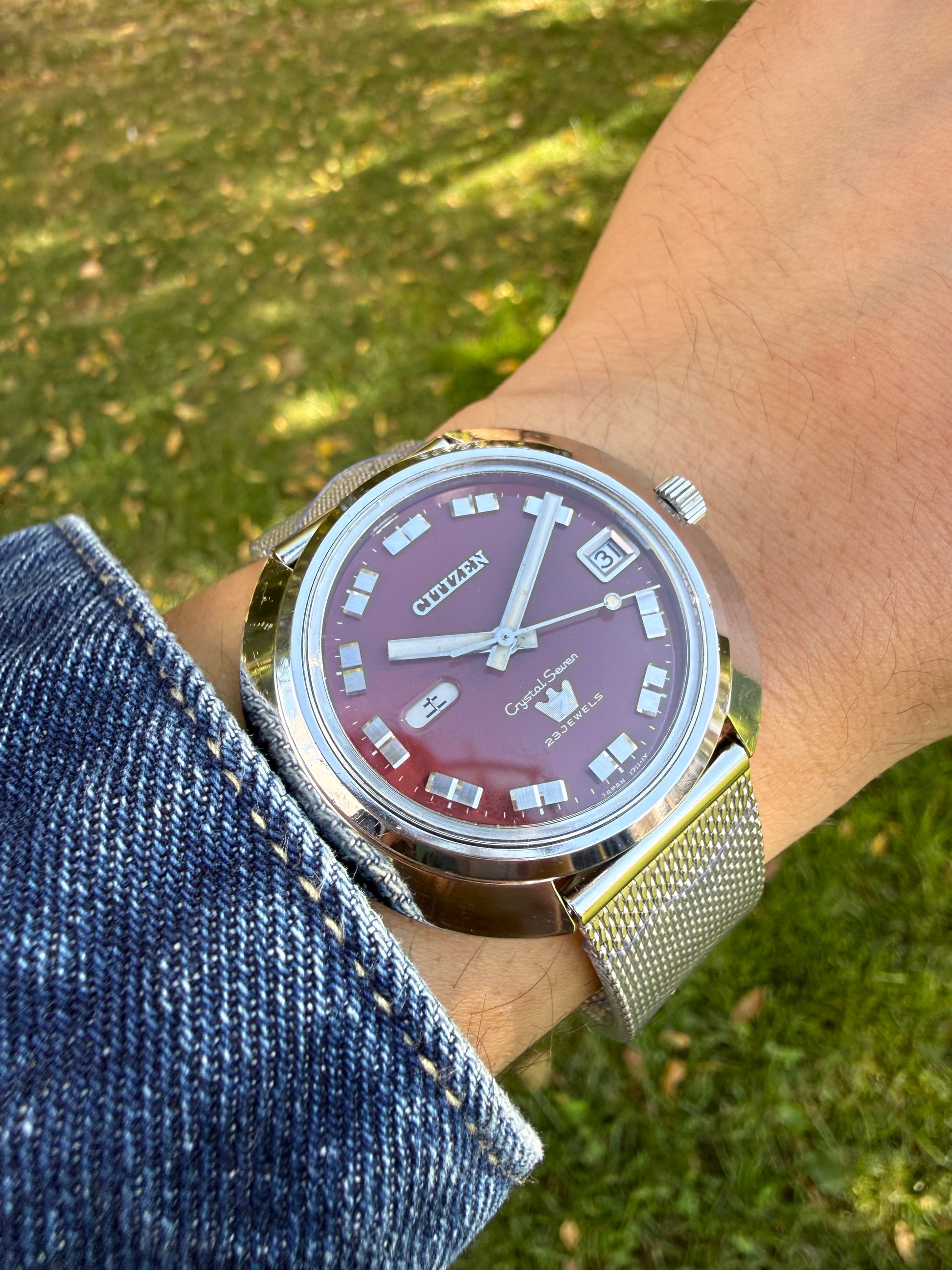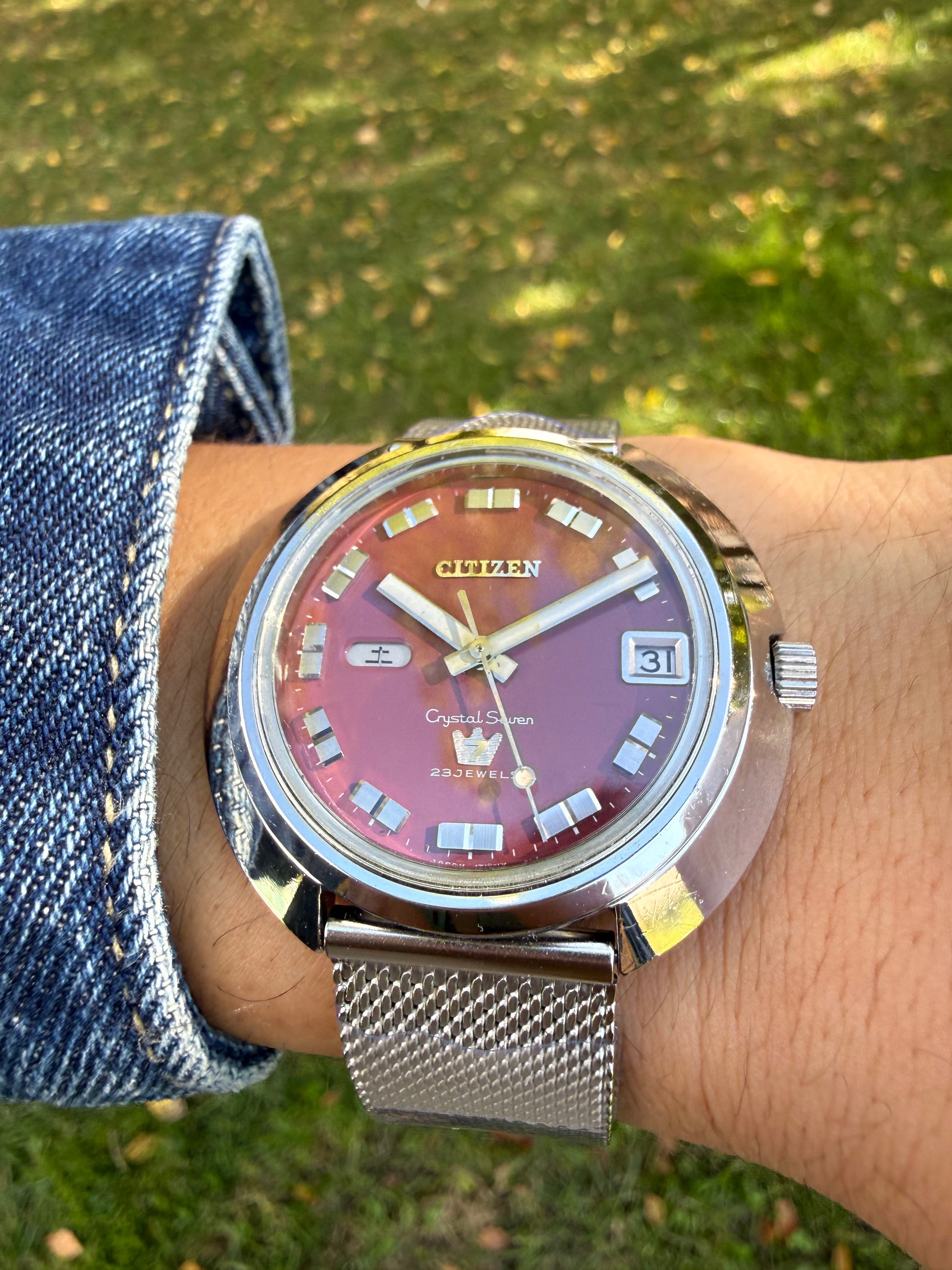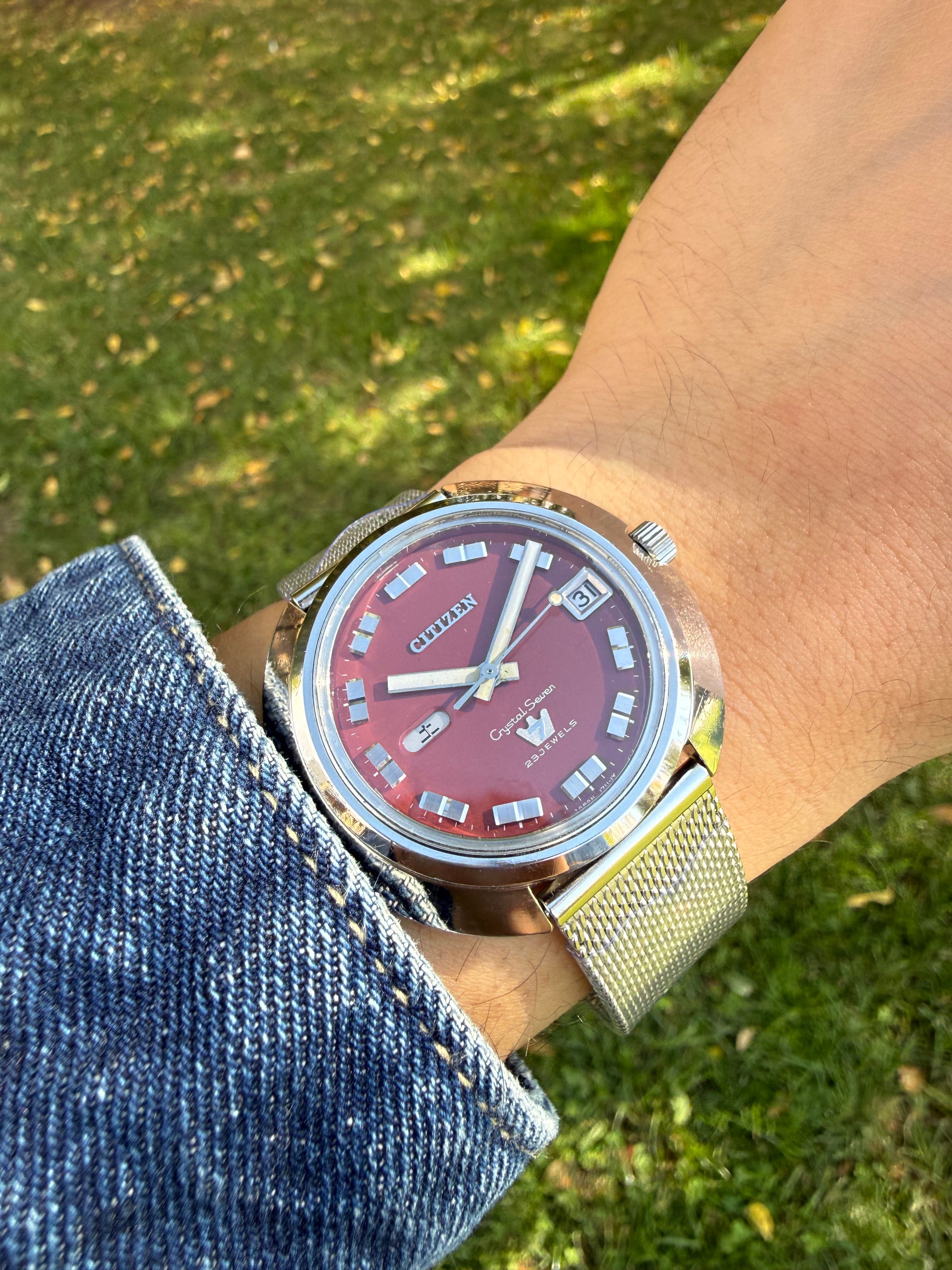 Reloj vintage UFO con una forma muy diferente y rara con calendario de japonés kanji y al lado derecho una ventanilla para poder ver el día del mes