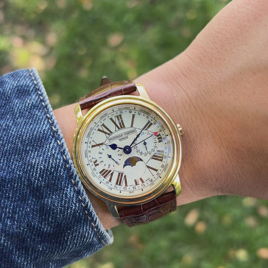 Bonita unidad de la prestigiosa marca Frederique Constant se trata de una pieza con la que podemos visualizar la fase lunar, día de la semana, día del mes y mes del año en el que estamos.